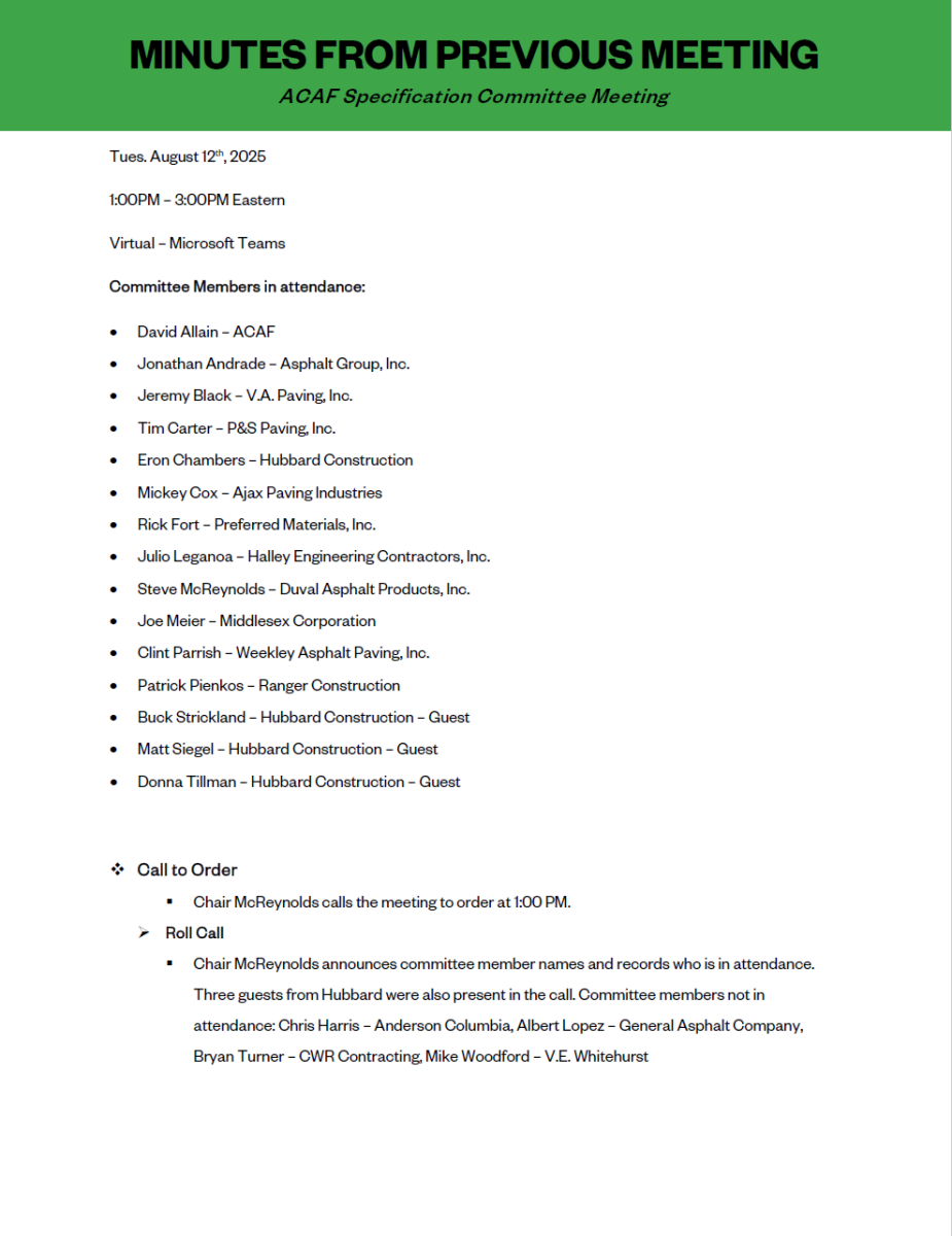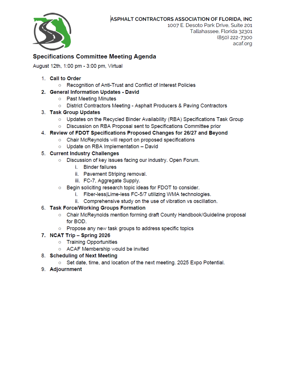 The ACAF Specifications Committee is comprised of Florida asphalt industry experts who are committed to advancing the evolution and refinement of our state’s governing specifications. It does so by maintaining vigorous internal communication amongst its members and sharing it’s ideas and proposals through a healthy and mutually beneficial partnership with the FDOT.